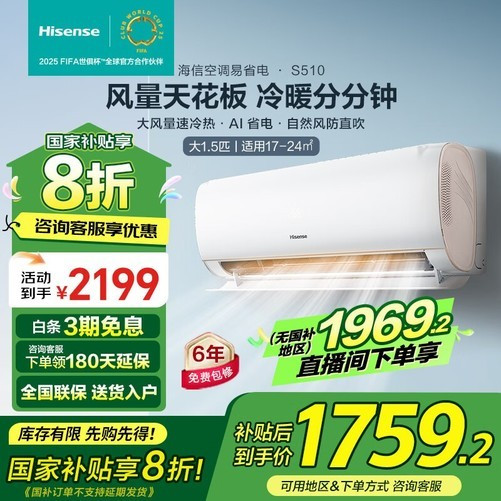 海信(Hisense)易省电系列壁挂式空调S510,1.5匹一级能效,节能又高效,助您打造舒适家居环境。这款空调凭借其卓越的性能和省电技术,成为家庭空调的理想选择。目前,该款空调正在参与国家补贴20%活动,叠加满999减100元优惠券后,原价2199元的空调到手价仅需1759.2元,性价比超高,适合陕西、江苏、四川、青岛、吉林等地区的用户选购,好价难得,值得立即下单体验!
